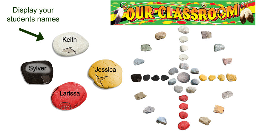 The Medicine Wheel is a circular symbol representing the wholeness of traditional Indigenous life, unity and harmony. This set will allow you to bring those ideals to your classroom. This set comes with 36 4" x 2" paper rocks that come together to form one large 36" x 36" medicine wheel. Each rock has a spirit image on it which allows you to follow the map provided when displaying this Medicine Wheel Bulletin Board.